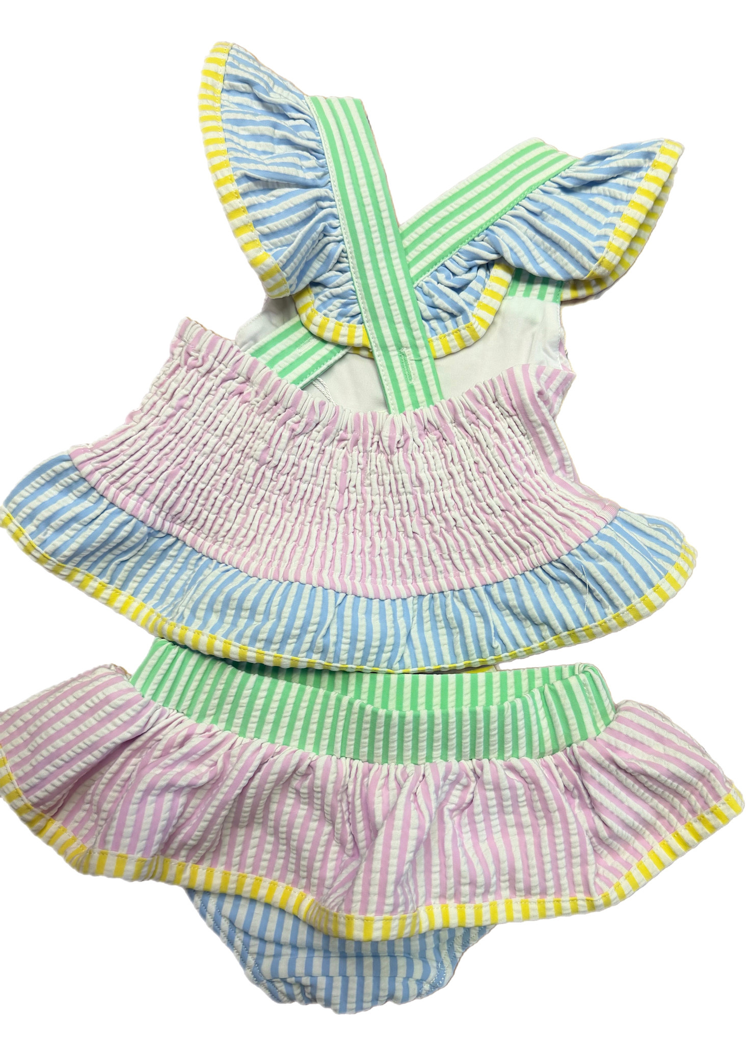 2 Piece Multi Striped Ruffles Girl Swim Suit