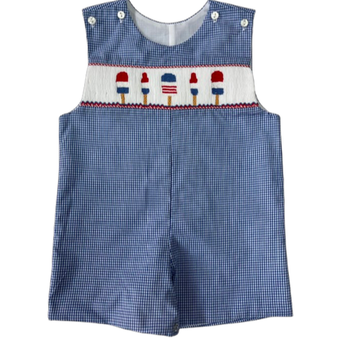 4th of July Lollipops Smocked Blue Gingham Shortall