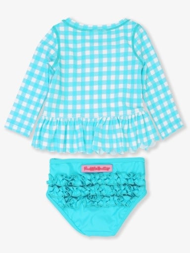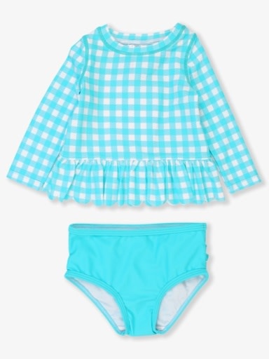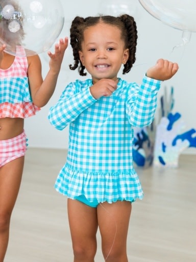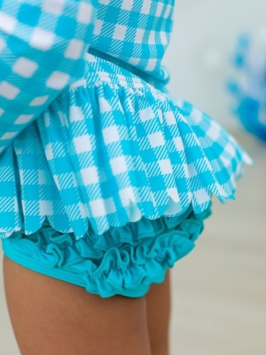 *PRE-ORDER*Bright Aqua Gingham Scallop Hem Long Sleeve Rash Guard 2-Piece, with Signature Rear Ruffles