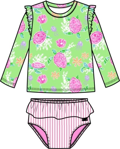 *PRE-ORDER*Neon Turtle Tide Flutter Long Sleeve Rash Guard Skirted 2-Piece Swimsuit