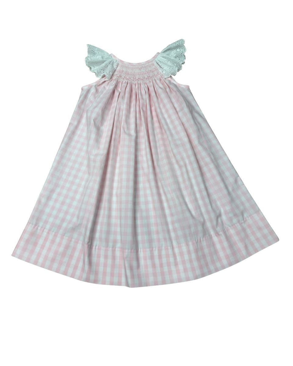 Delaney Pink Gingham White Eyelet Smocked Angel Wing Bishop